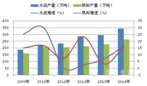 圖1:西藏2009-2014年水泥、熟料產(chǎn)量增長(zhǎng)情況